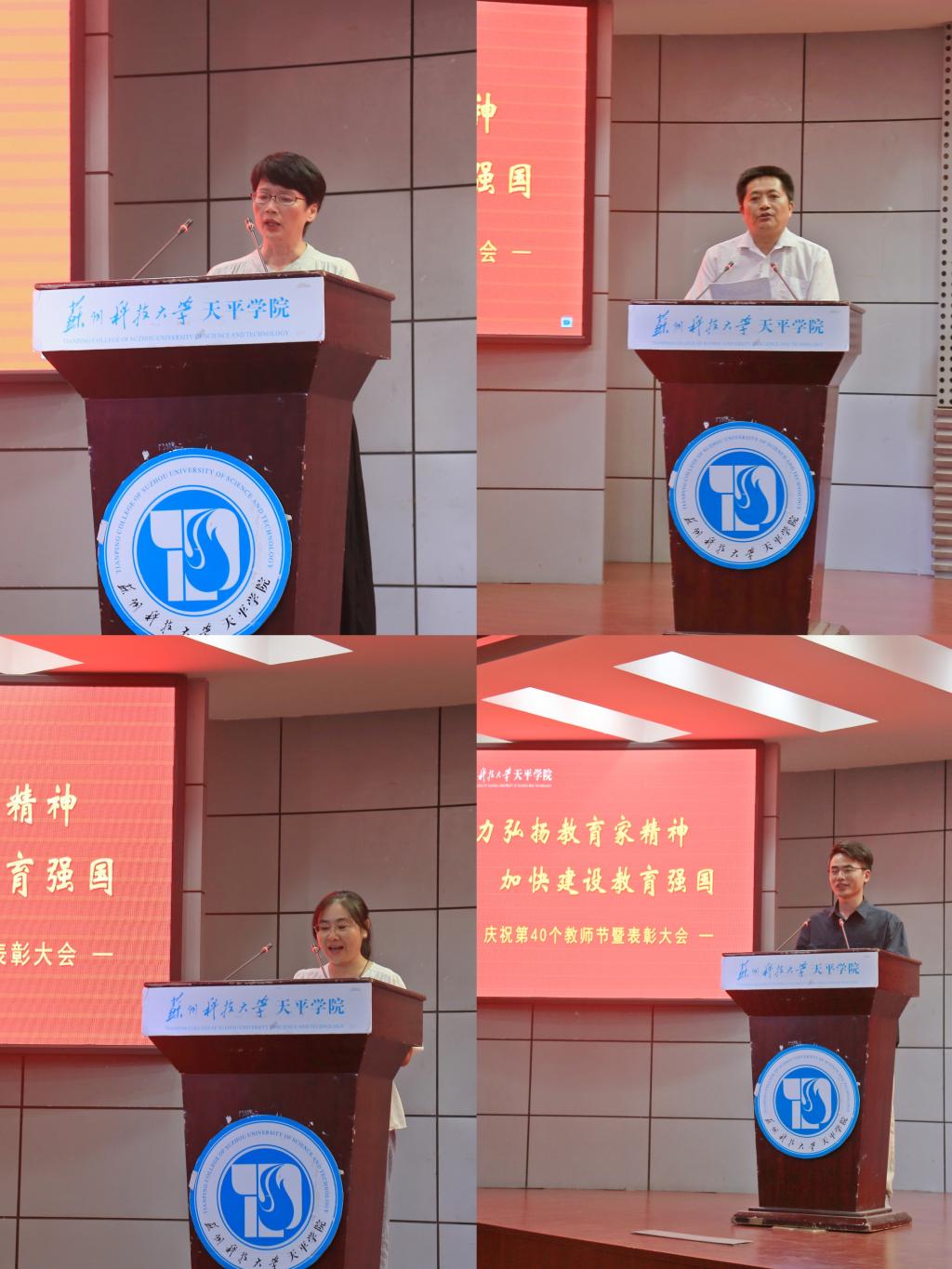 大会在庄严的国歌声中拉开帷幕。会上,党委副书记、副院长孙景宣读《关于表彰2024年度“三育人”工作先进个人的决定》,党委书记郑群向受表彰同志颁发荣誉证书并表示祝贺。优秀教师代表吴静梅、新入职教师代表苏天杰依次上台发言,分享自己工作生活中的感悟和思考。