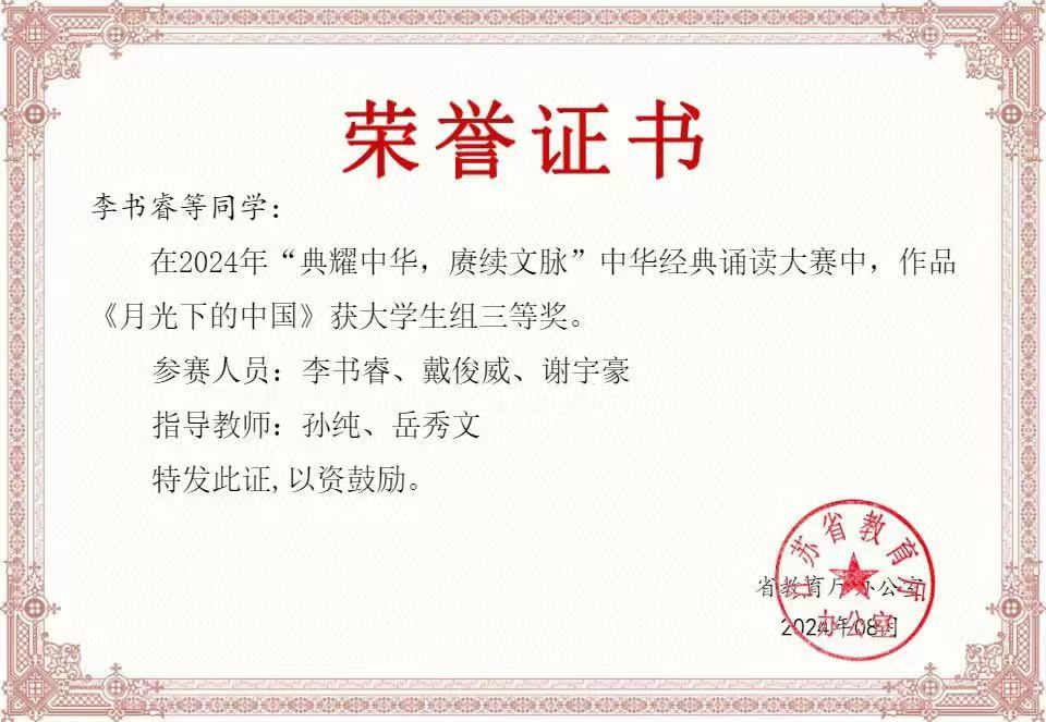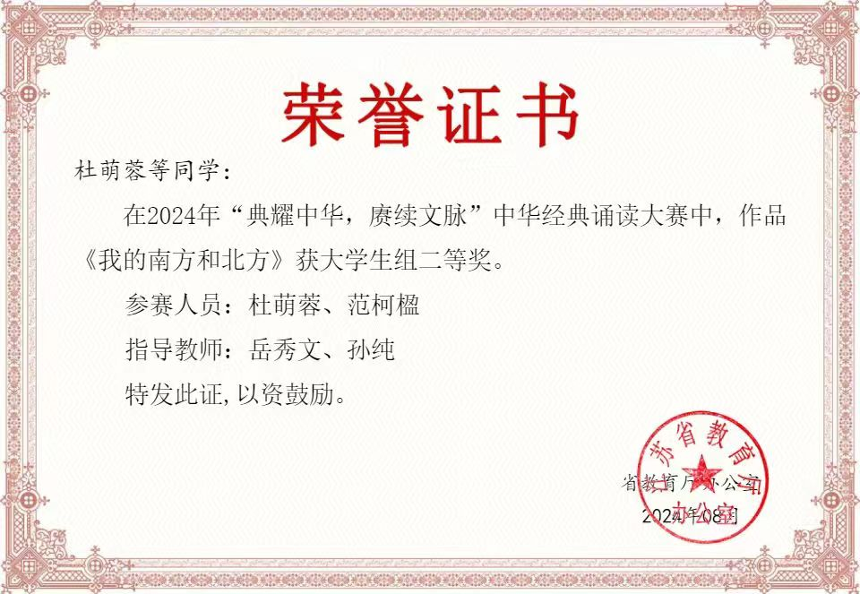 近日,“典耀中华 赓续文脉”江苏省2024年度中华经典诵读大赛获奖结果公布,由360环球在线注册选送的两组参赛选手历经语言文字知识及诵读常识网络测评、录制诵读视频两个环节,最终获二等奖1项、三等奖1项,这一成绩在省内同类高校中名列前茅。本次大赛共评出特等奖3项、一等奖6项、二等奖12项、三等奖17项、优秀奖19项。