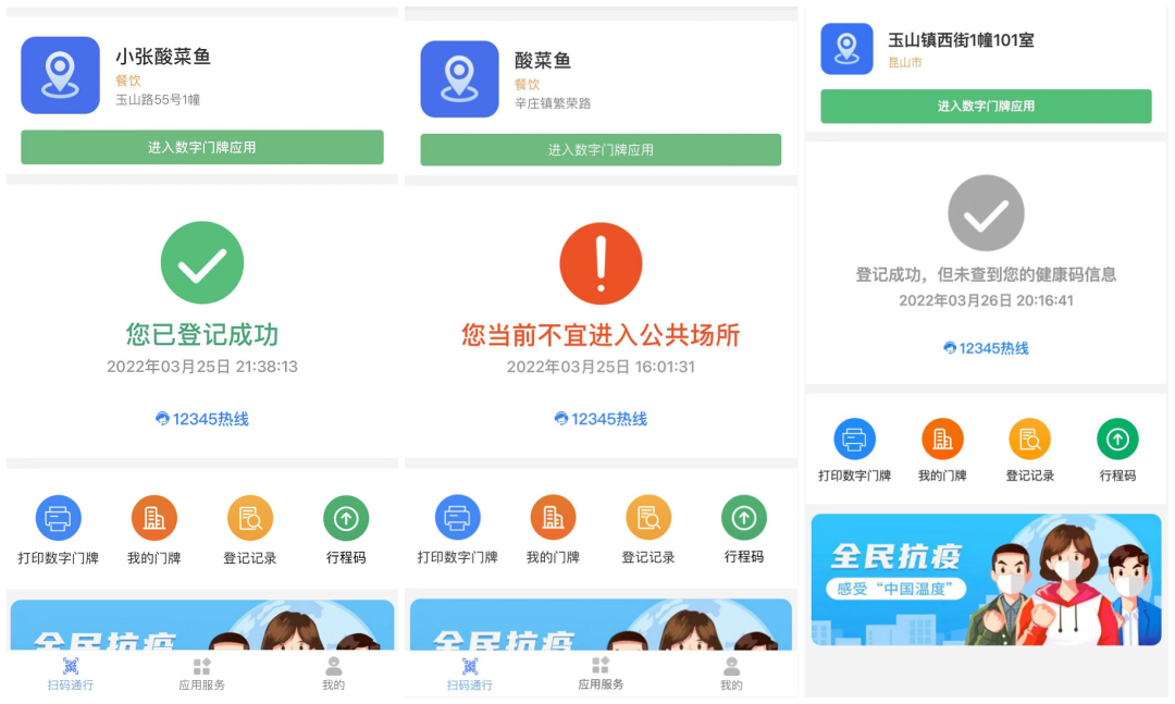 第三步:核酸检测。“苏康码”是绿码,则会提示“您已登记成功”;“苏康码”是红码或黄码,则会提示“您当前不适合进入公共场所”,不得入内,按规定落实相应管控措施。
