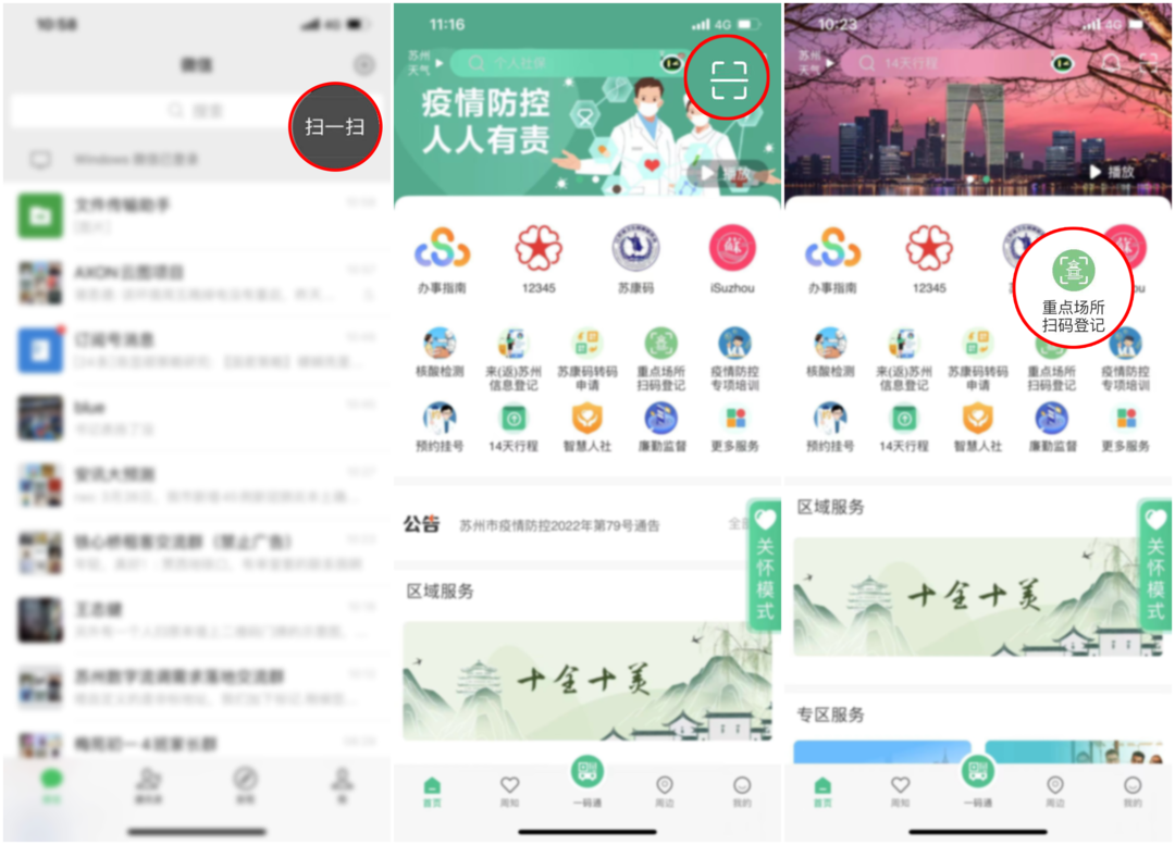 第一步:扫码。入校人员入校时,在“苏周到”APP、微信“扫一扫”功能进入“重点场所扫码通行”应用,打开“扫一扫登记”功能,扫描场所张贴的二维码。