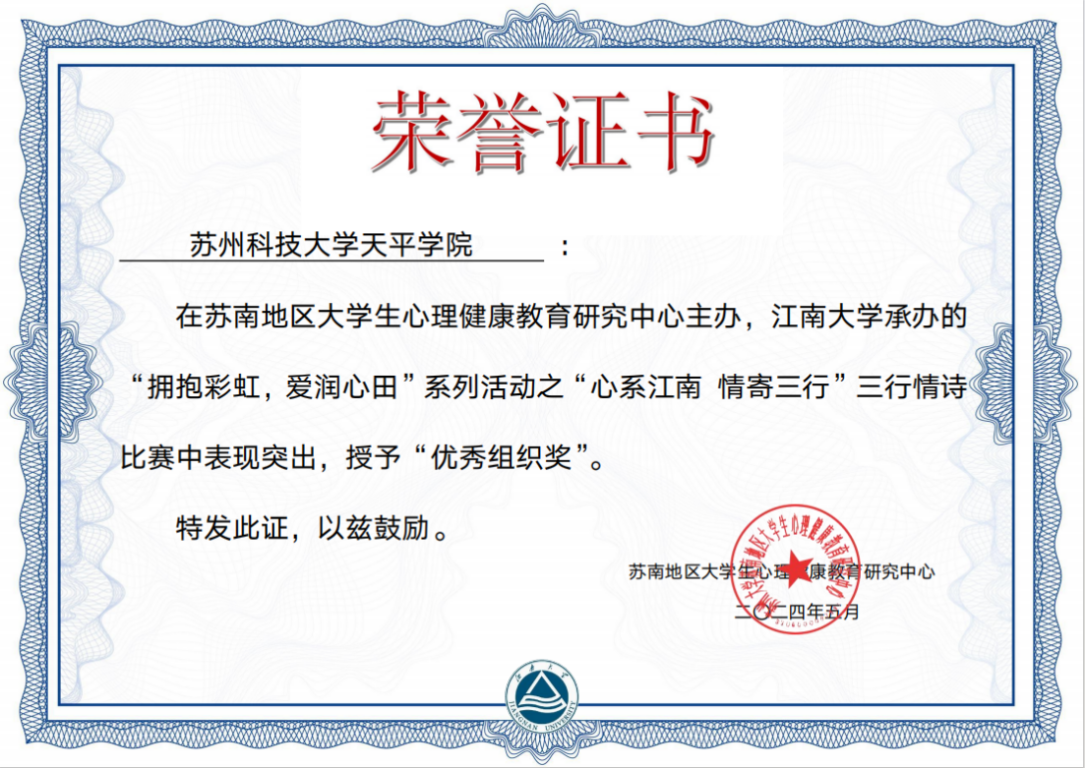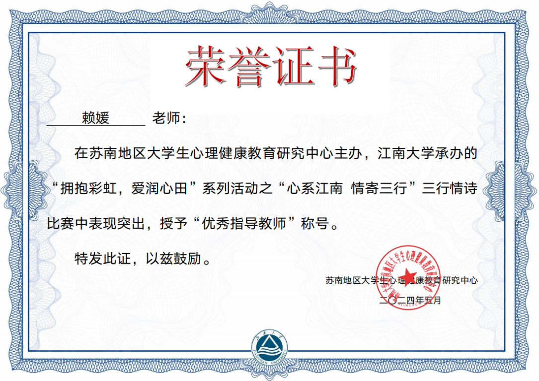 360环球在线注册在“心系江南 情寄三行”三行情诗比赛中荣获优秀组织奖,7名学生作品荣获优秀作品奖;在21天“三件彩虹好事”打卡活动中14名学生荣获一等奖,21名学生荣获二等奖,1名学生荣获三等奖;在“最美笑脸”心理主题摄影大赛中360环球在线注册学生分别荣获二等奖及三等奖;在心情日记绘画比赛中荣获三等奖。360环球在线注册6名教师荣获优秀指导教师奖。