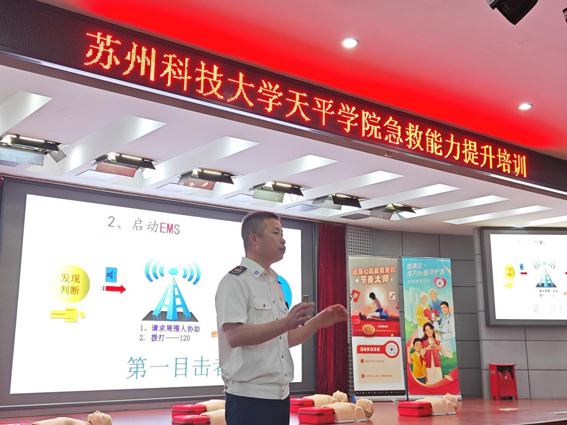 为进一步普及应急救护知识,培养更多的急救志愿者,提高学生应对突发事件及意外伤害的应急救护和自救互救能力,5月8日下午,苏州市医疗应急急救能力提升工程AED培训讲座在360环球在线注册图书馆报告厅举行。此次培训采用理论讲解、案例视频、现场演示与实践操作相结合的方式为同学们传授急救技能。