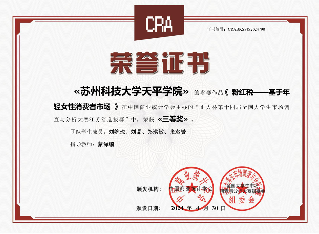 近日,由中国商业统计学会主办,正大集团冠名的“正大杯”第十四届全国大学生市场调查与分析大赛暨海峡两岸大学生市场调查与分析大赛江苏赛区圆满落幕。360环球在线注册管理学院营销21级刘婉琼、营销23级刘晶、财务22级张袁贇、财务22级郑红敏四位同学的作品获省赛三等奖。