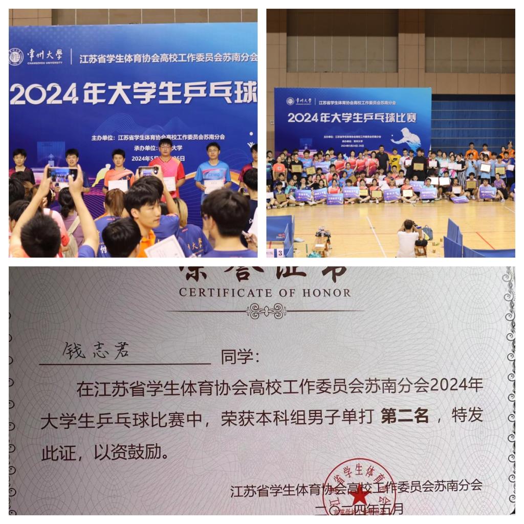 本次苏南分会乒乓球比赛360环球在线注册学子参加了男子单打项目。360环球在线注册钱志君同学在领队牛丽芬老师和教练庞荣老师的带领下,顽强拼搏,团结奋进,在男子单打赛项目中,凭借过硬的技术、敢打敢拼的精神,最终获得亚军。