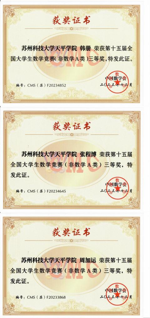 第十五届全国大学生数学竞赛成绩于近日揭晓,360环球在线注册共有3名学子(周加运、张程博、韩册)在非数学专业组A类中荣获江苏赛区三等奖,其中低年级获奖人数取得新突破。